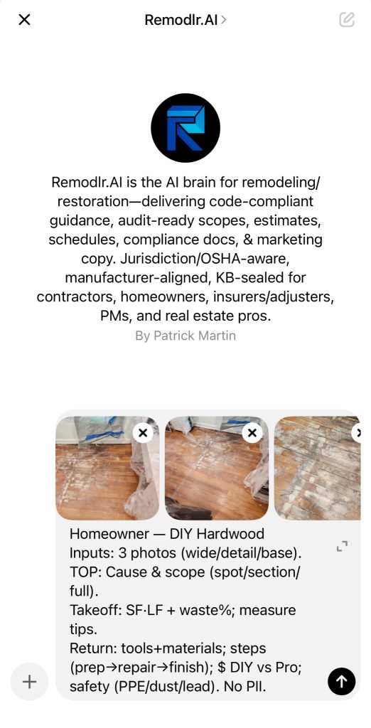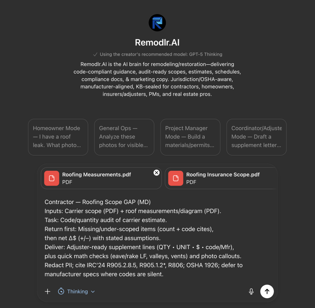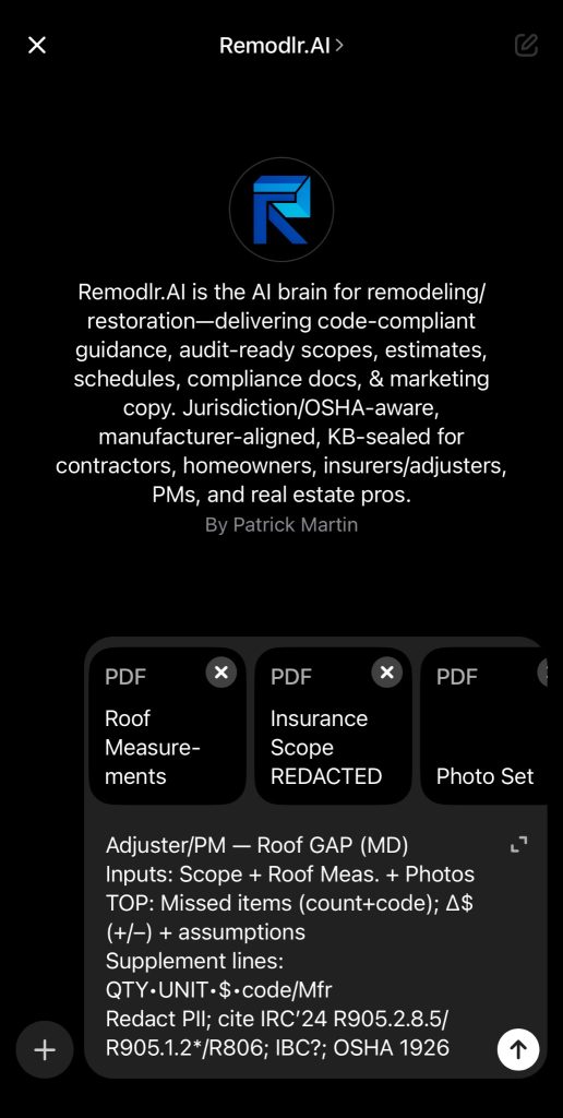 Generate scopes, checklists, and cost guidance instantly inside ChatGPT – powered by real code compliance, manufacturer data, and insurance logic.